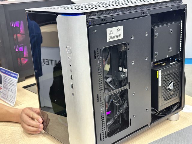 一款可直立可橫躺的ATX機殼,旁邊還有展示SFX電源。