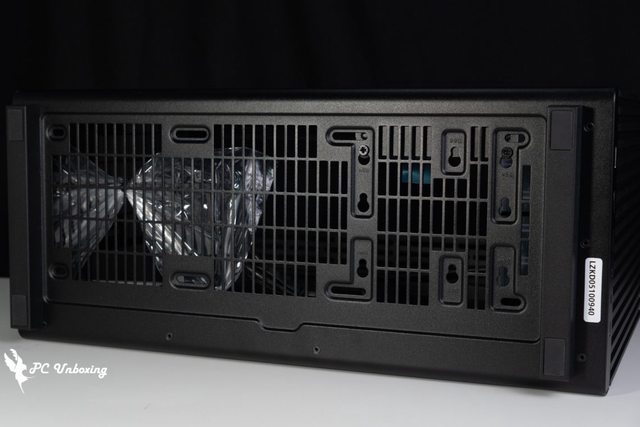 機殼後方可以安裝 120 mm 的風扇以及最多四槽 PCIE 設備,上半部有電源供應器延長插座