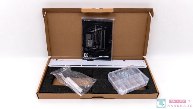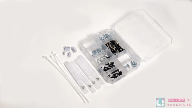 配件包內有說明書一本、束帶與魔鬼氈、螺絲與額外 I/O 防塵塞,還有一件用於機殼下方