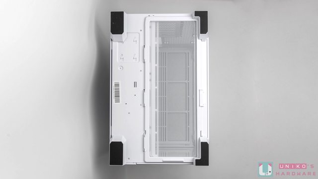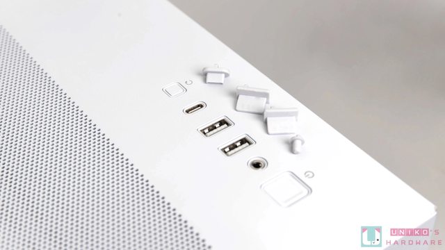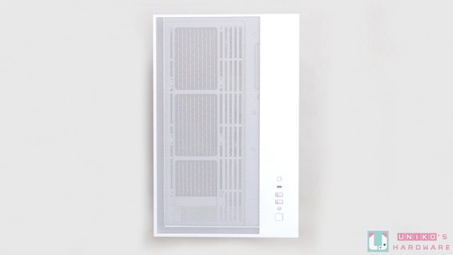 機殼上方有大面積進氣網孔設計,右下方位置是前置 I/O;底部有大面積快拆式進氣防塵濾
