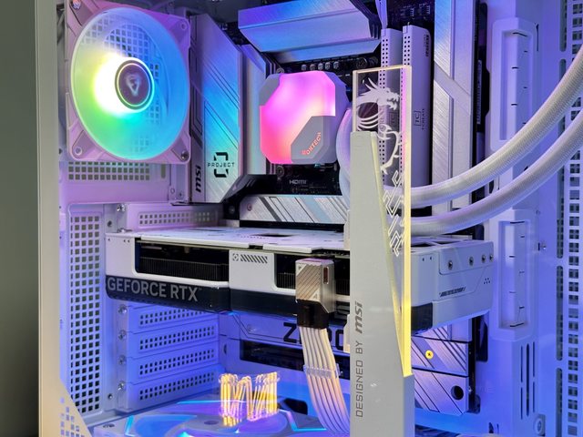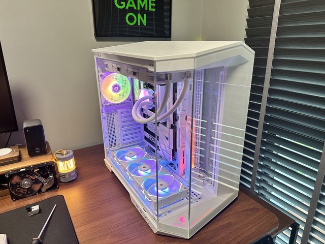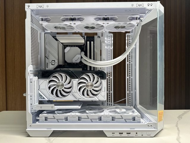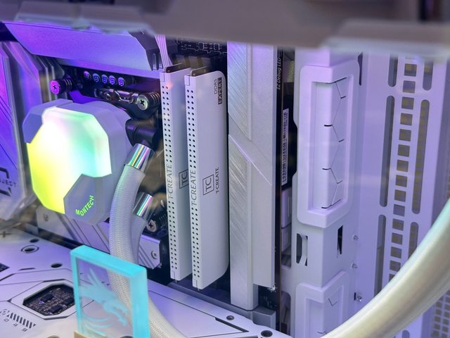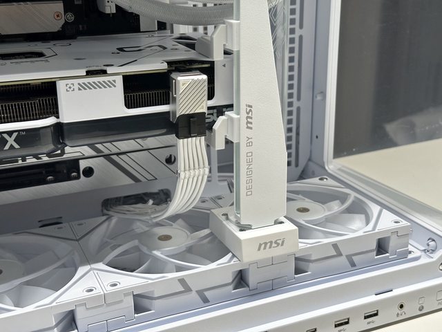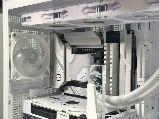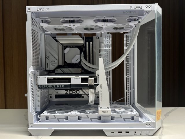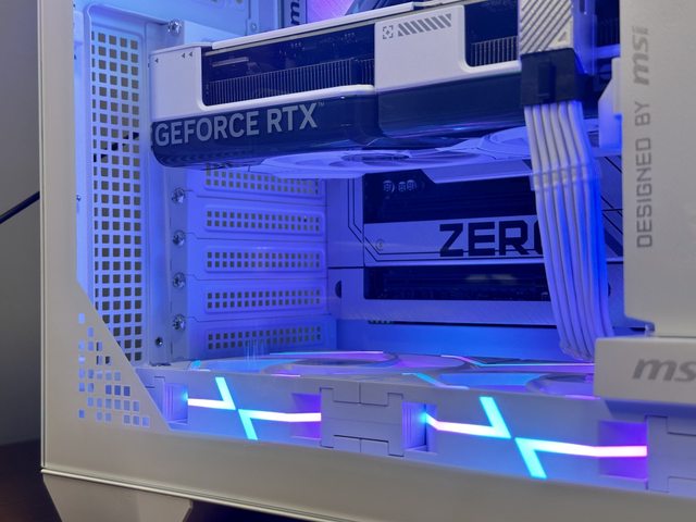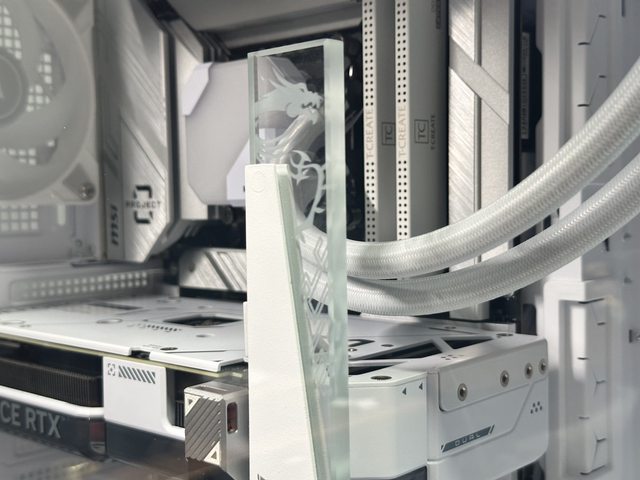 裝上顯示卡後是另一種風情,就可惜RTX4070 Super Dual上有一條粗黑的線條,在幾乎白