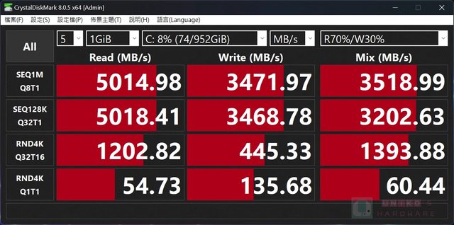 CrystalDiskMark 8.0.5 SSD 讀寫測試,讀取 5014.98 MB/s、寫入 3471.97 MB/s。