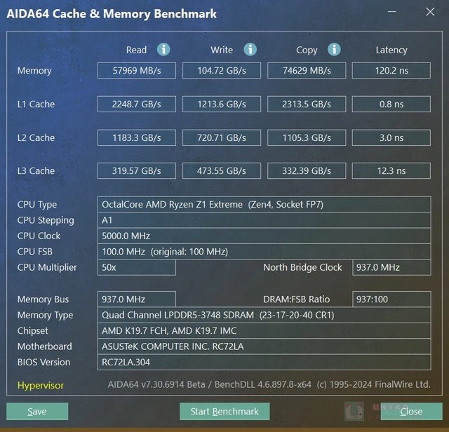 AIDA64 AMD RYZEN Z1 EXTREME 處理器相關資料。記憶體讀取 57969 MB/s、寫入 104.72 G