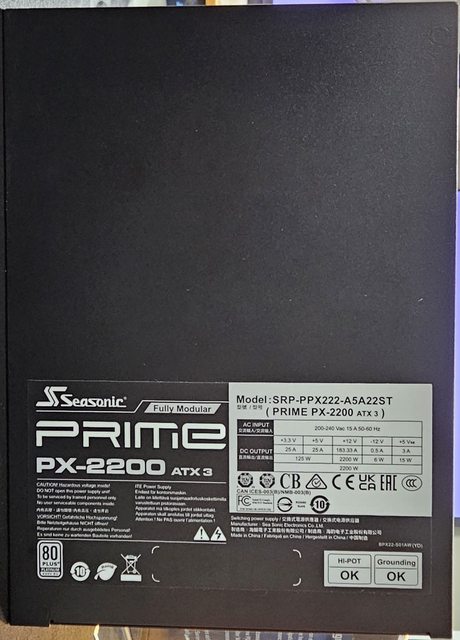 ▼PRIME PX-2200 ATX 3的電源標籤,此電源限定200-240V輸入,才能完整釋放12V
