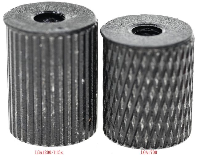 ▼LGA1200/115x托架固定柱外觀為直條紋溝槽(左),LGA1700托架固定柱外觀為斜線壓花(