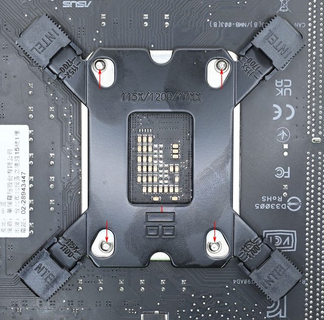 LGA1700托架固定柱有黑色墊片那面朝下鎖入固定螺牙(3),4個固定柱完全鎖入固定螺牙