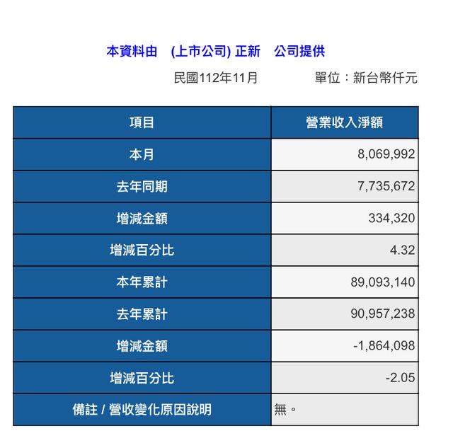 備註 / 營收變化原因說明 無。