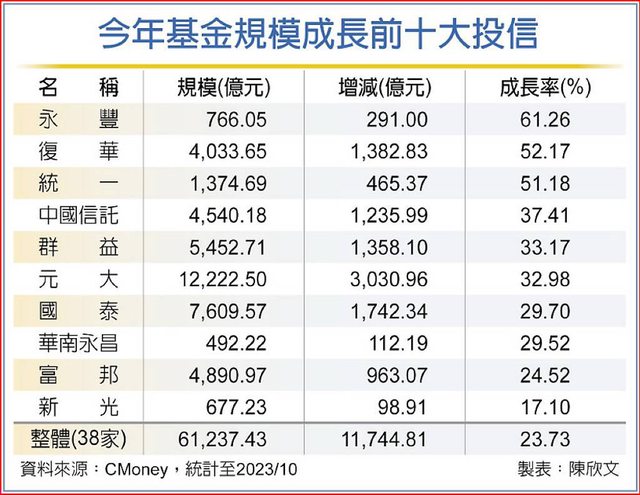 ,其中,永豐投信成長超過6成,幅度最大,其次是復華、統一兩家投信成長逾5成,中國