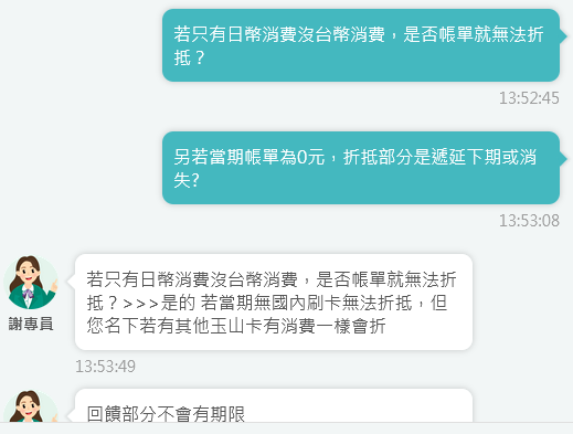 → katy50306 : 玉山雙幣是回饋新台幣折抵? 那還是有匯差問題.. 07/25 13:20
