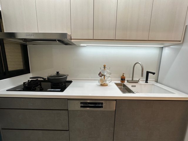 廚房用了超白烤漆玻璃+矽鋼石檯面