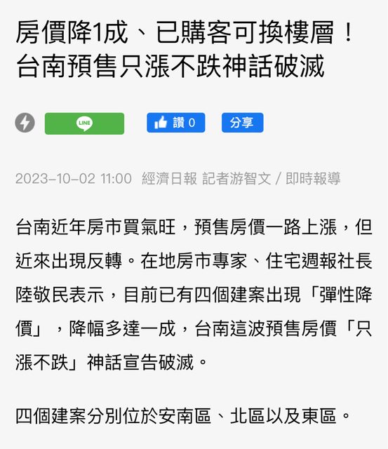 → cooldavid90: 不可能啦,台灣房價只會漲不會跌! 跌就是好心讓你上 10/06 19:41