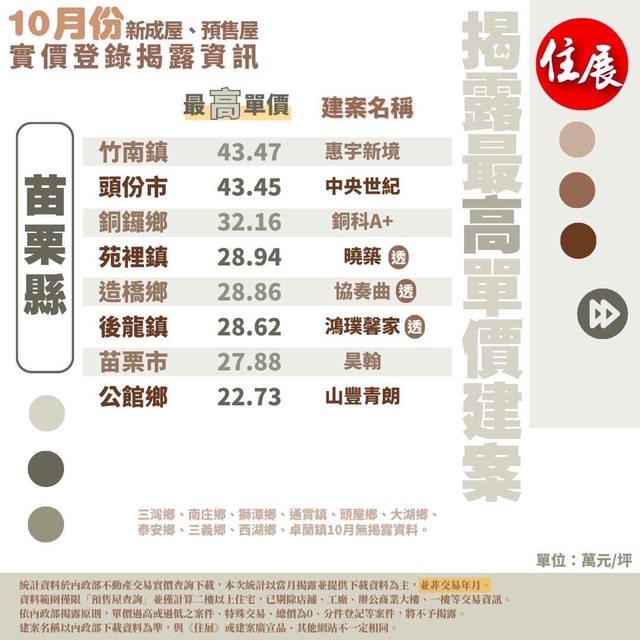 : 露資料,彰化縣、雲林縣、宜蘭縣、嘉義市及苗栗縣都出現四字頭成交單價,今年新案再