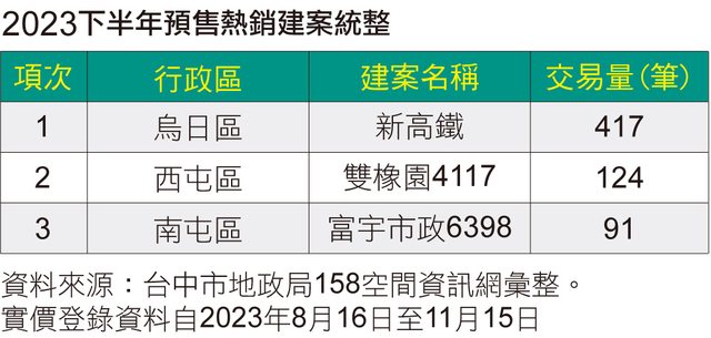 根據台中市地政局158空間資訊網資料,統計顯示今年下半年預售熱銷建案交易價量,以位於