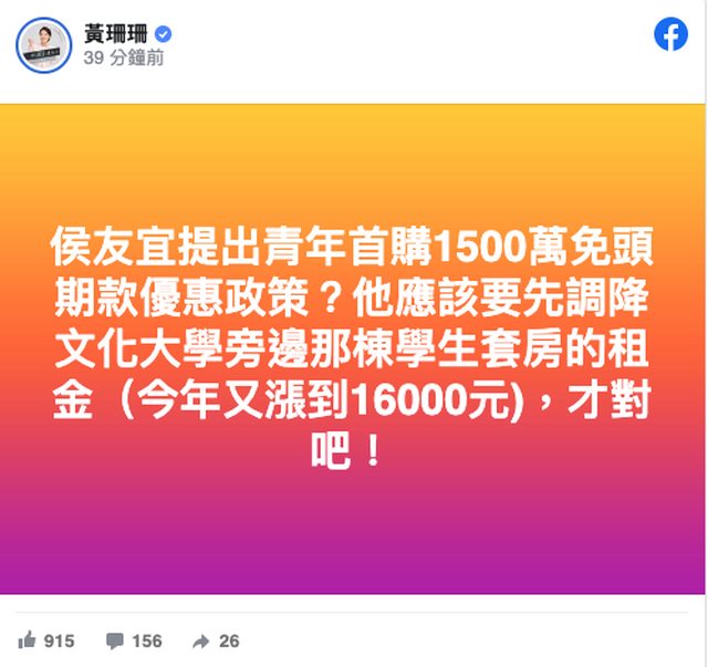 不料,黃珊珊隨後在臉書提到侯友宜在文化大學附近的學生套房,並開酸,「侯友宜應該要