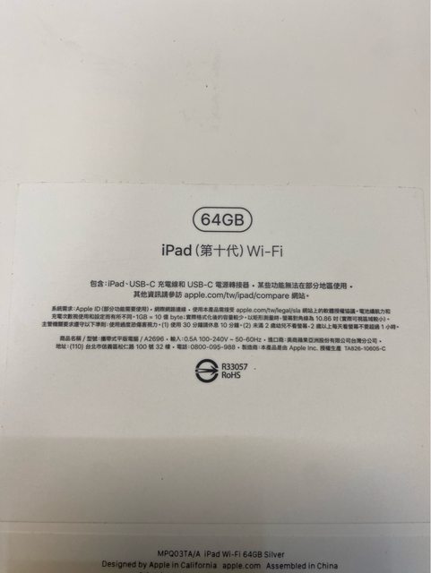 欲售物品:iPad 10 Wifi 64G 灰色