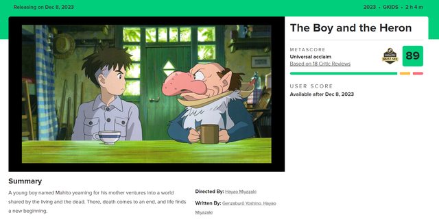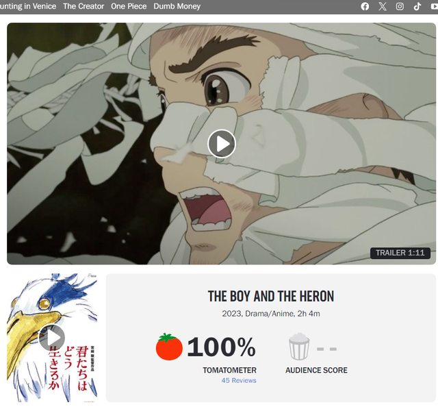 ※ [本文轉錄自 C_Chat 看板 #1b2PV5A6 ] 作者: nanachi (上善若水) 看板: C_Chat 標題: [閒聊] 宮崎駿新作有機會再入圍奧斯卡嗎 時間: Tue Sep 19 20:44:51 2023 宮崎駿新作《蒼鷺與少年》這次在多倫多影展上 觀眾票選獎第三名 此外爛番茄 https://i.imgur.com/Zf8RB4y.jpg