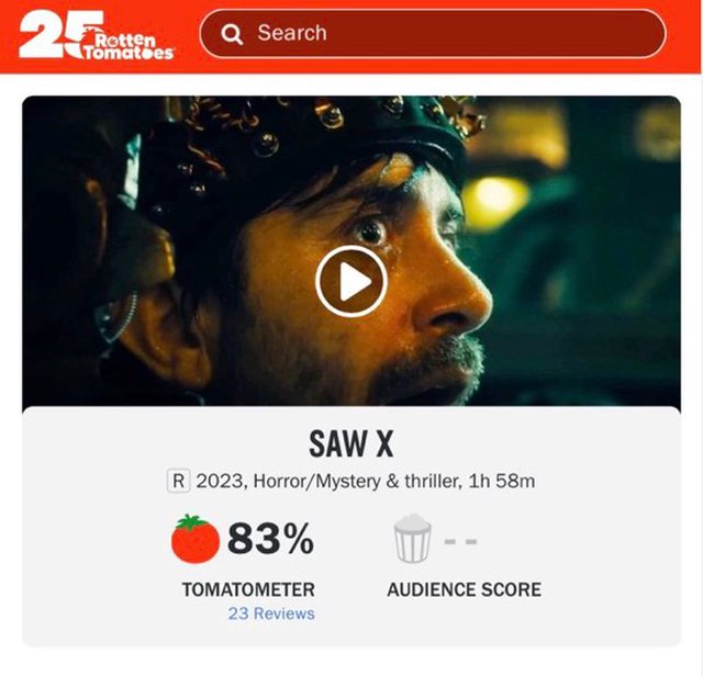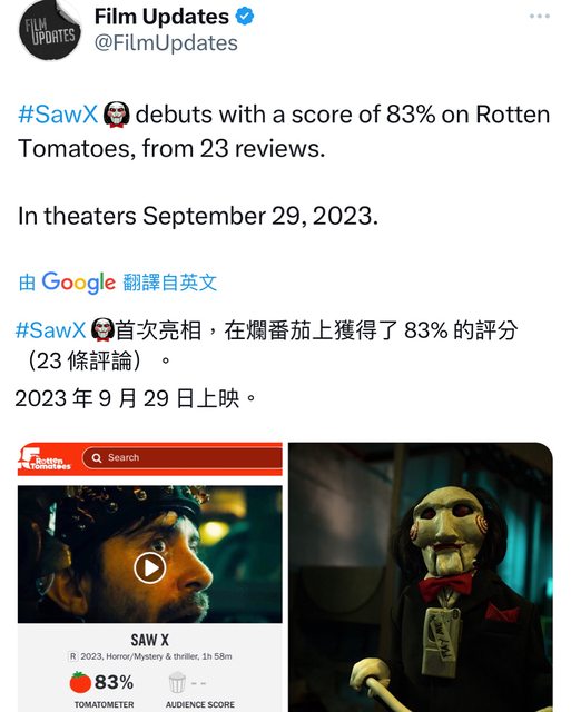 《奪魂鋸X》首次亮相,在爛番茄上獲得了 83% 的評分(23 條評論)。 2023 年 9 月 29 日上映(美國)。 https://i.imgur.com/XuCAnO0.jpg