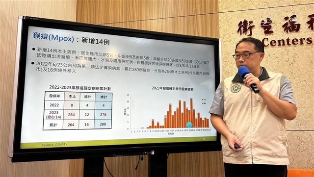 我國自去年6月23日將Mpox列為第二類法定傳染病,截至8月14日累計確診280例病例(264