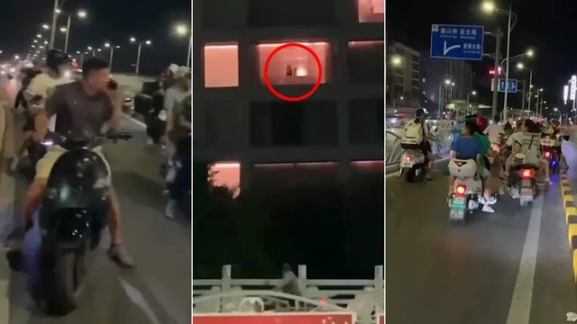 ,讓飯店外的民眾看得清清楚楚,由於窗外就是幹道,許多機車道騎士停車觀戰、拍攝,