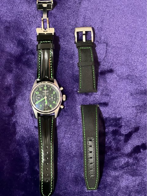 新舊程度:9.9成新,錶帶購入後及換上訂制馬臀皮錶帶+副廠蝴蝶扣,隨附給你