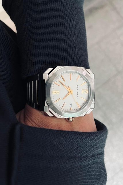 4點半位置為日期顯示窗,搭配手工切面時標,時標做工細緻度超越先前分享過的Octo半金大三針錶款,錶盤流露出而典雅又現代的BVLGARI獨特 風格。