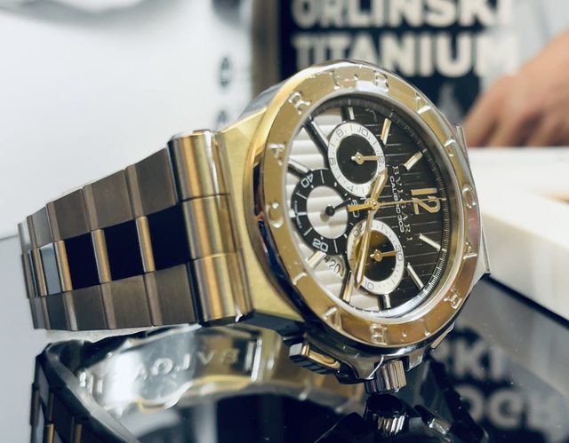 錶盤的設計優雅,每一件Diagono 腕表錶盤皆由BVLGARI原廠打造完成,全部製作過程需要4個月之久,錶盤採用擁有悠久歷史的内填珐琅技術,三個小錶盤緊密相連,表殼由75個拉絲不鏽鋼部件組成,邊緣刻有凹槽,再坎入表圈。