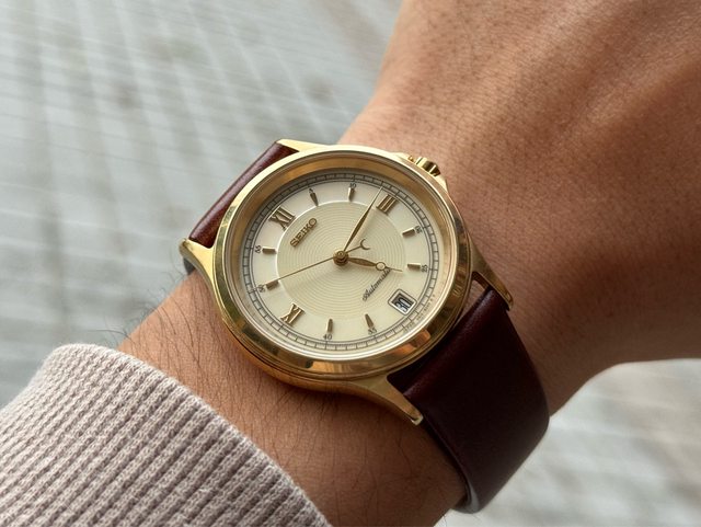 精工經典不復見的誠意之作4S系列。奶油色面盤與金色立體時標,為一隻優雅的文錶