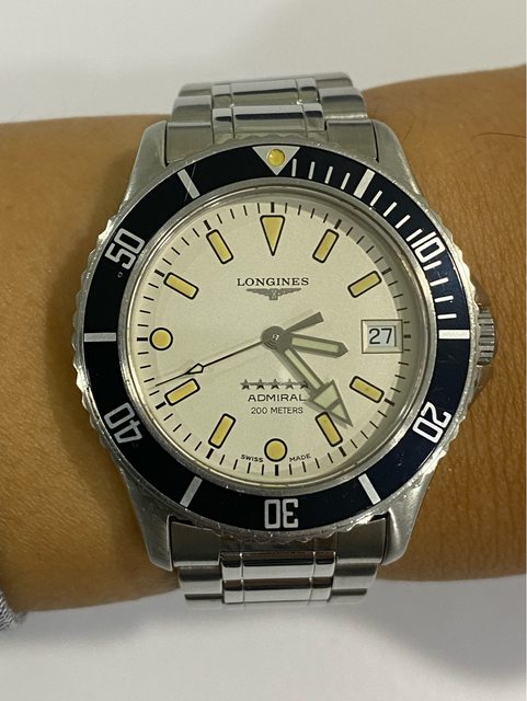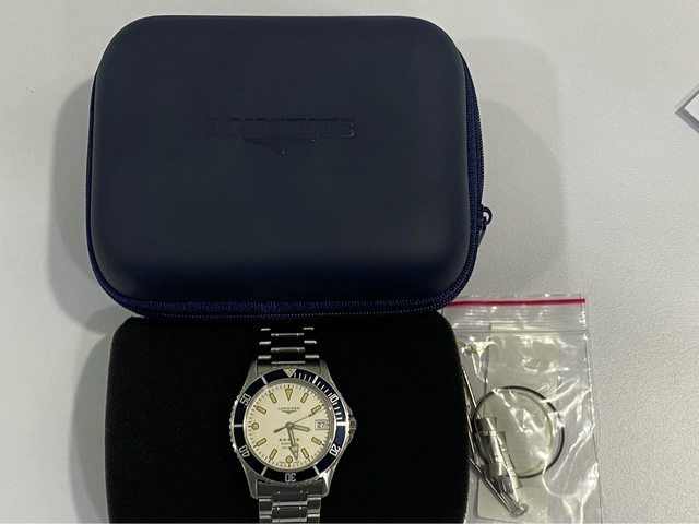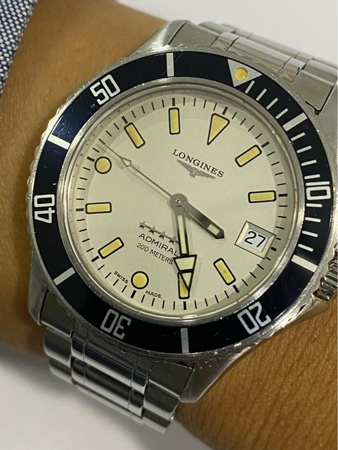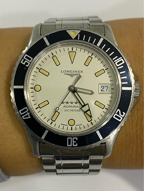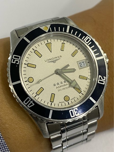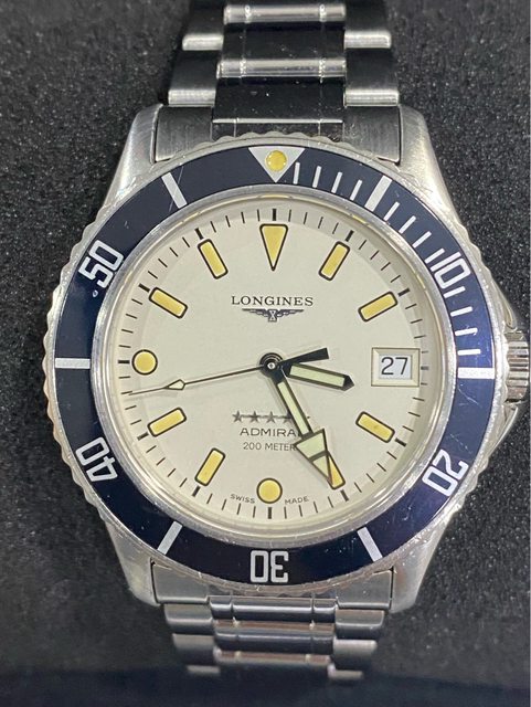 【商品名稱】浪琴 五星上將 老潛 【商品價格】13860元(含店到 【新舊程度】如圖 【附件】單錶乙顆,附浪琴攜行盒 ————————————————— 型號7463 90年代浪琴老潛,面盤時標已氧化成漂亮的南瓜色,2023/3月有回swatch 台北維修中心 保養更換該換的料件(花了一萬元左右),昨天才從Swatch拿回來,另有目標故出售,看 膩了浪鬼的可以試試這顆漂亮的五星上將。 不議價請見諒 錶徑38mm(含龍頭約40mm) 浪琴L633.5 機芯(ETA2824) 走時精準正常 日期快調正常 藍寶石玻璃 旋入式龍頭 —————————————————- 匯款後店到店,無面交服務