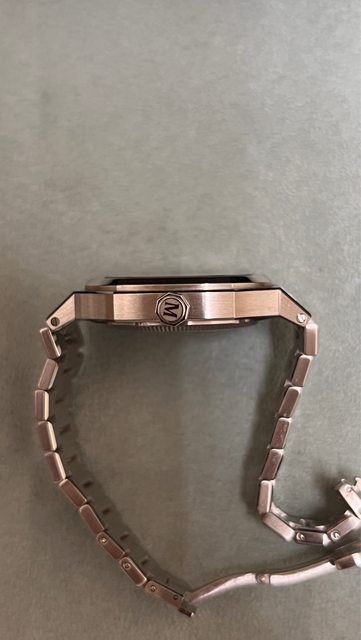 熱門鮭魚面,殼型近似鸚鵡螺,一體式錶帶,錶節固定為螺絲插銷形式,錶扣為蝴蝶扣, 並有一立體浮雕LOGO,整體做工精緻,可惜手圍因無法調整剛好配戴的習慣,故出售 *本錶為隆達150機芯版本*
