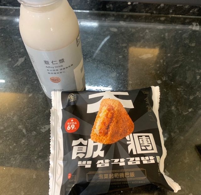 【商品名稱/價格】:大飯糰-泡菜起司鍋巴飯52元, 配薏仁漿69元