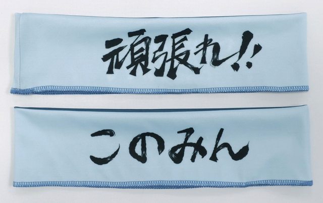 淺藍色面朝外穿戴,「頑張れ!!」字樣或「このみん」字樣朝前皆可!