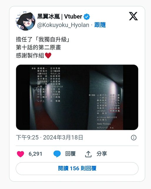 最新播出的第 10 集,動畫/插畫家兼 VTuber「黑翼冰嵐」擔任第二原畫,本人在新話