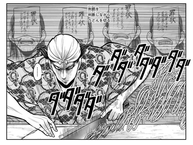 一邊切麵一邊給抓到的罪人判刑然後親自處決
