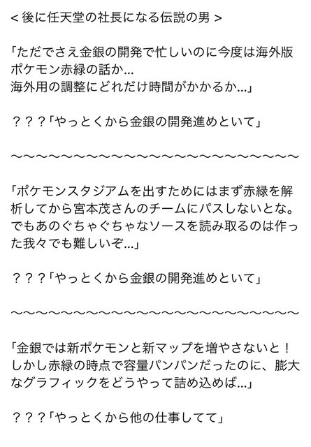 <之後成為任天堂社長之傳說中的男人> 「搞金銀版的開發就忙死了現在還來海外版寶可夢赤綠的事情… 就不知道調整海外版要花多少時間了…」 ???「這些我來淦你們繼續弄金銀的開發吧」 ~ 「為了要出寶可夢競技場必須先得解析完赤綠之後再交棒給宮本茂先生的團隊才行。 但是要從那混雜的原始碼之中讀取出來對做出來這些的我們來說也是件困難的事情啊…」 ???「這些我來淦你們繼續弄金銀的開發吧」 ~ 「金銀版必須得增加新的寶可夢和新地圖才行啊!但是赤綠的那時候容量就飽飽的了,龐 大的圖像到底要怎樣才塞的進去啊…」 ???「我來淦你們去弄其他的工作吧」 ———— 岩田先生好帥哦….ˊ_>ˋ 這種秘話一直都十分有趣呢 -- ※ 發信站: 批踢踢實業坊(www.ptt-club.com.tw), 來自: 42.74.0.142 (臺灣) ※ 文章網址: https://www.ptt-club.com.tw/C_Chat/M.1711424970.A.BEF
