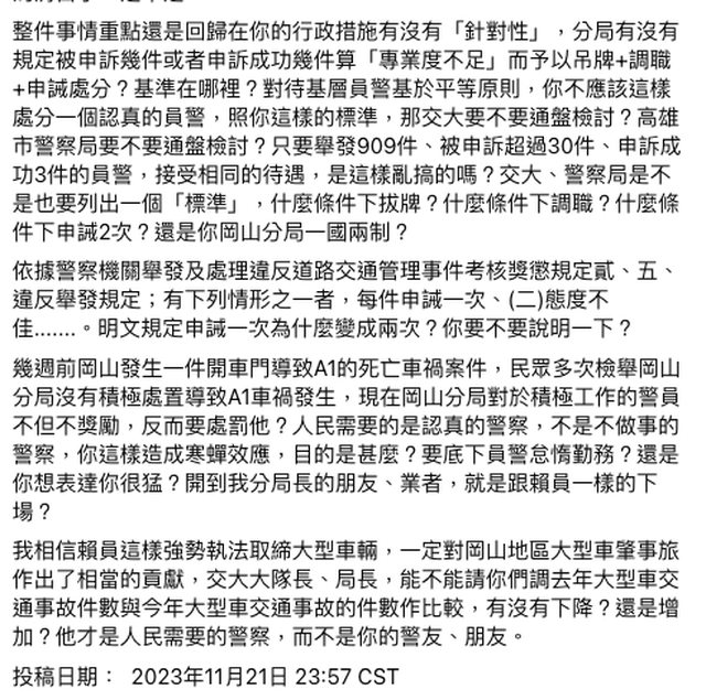 幾週前岡山發生一件開車門導致A1的死亡車禍案件,民眾多次檢舉岡山分局沒有積極處置