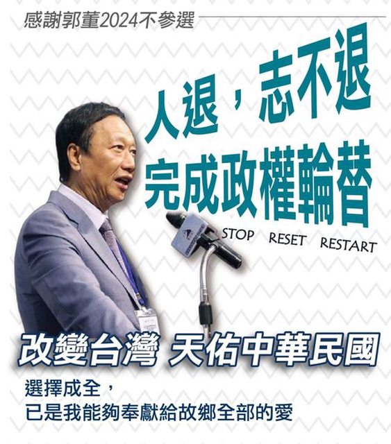 在郭董堅定的愛國情懷下,他對台灣的承諾與使命從未動搖。儘管已退選,仍致力於政權