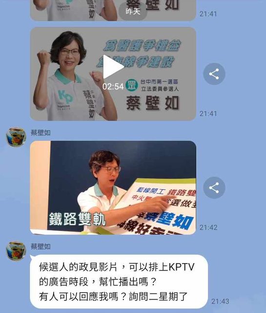 : 集, 蔡壁如的政見影片卻遲遲無法播出,33也不回應 請問這是被放生了嗎?