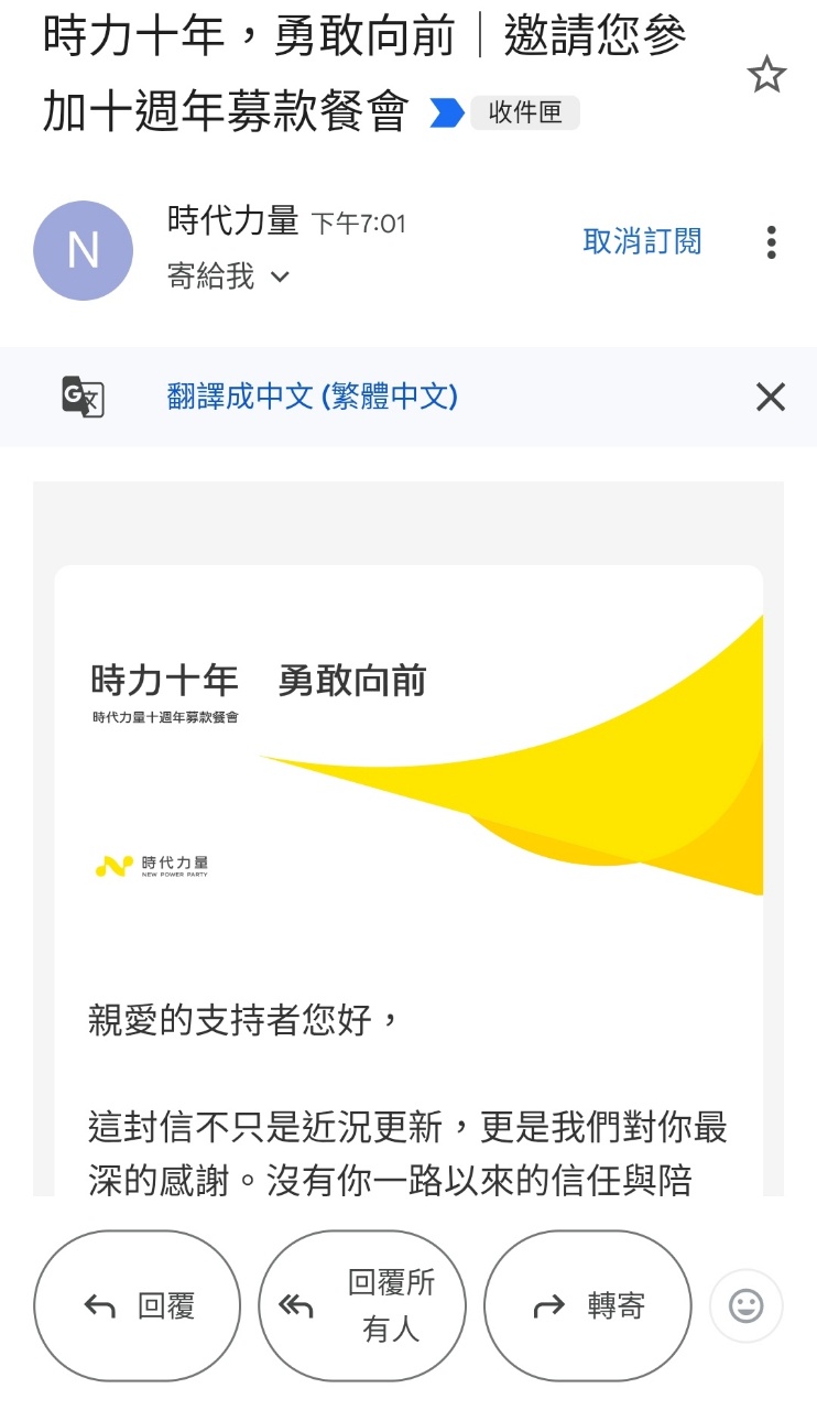 今天突然收到時代力量邀請募款
