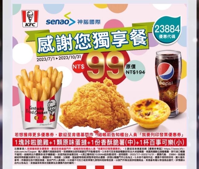 推 wuling1001: 剛用line購物app搜肯德基有滿99-10點 123.240.232.62 07/01 21:41