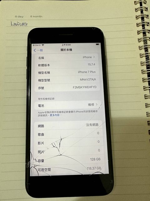 功能正常,螢幕有破損,機身有使用痕跡。電池健康度77%。
