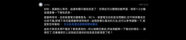 1. 電池健康度92%,下方附上與客服查詢的文字記錄