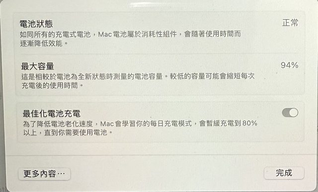 循環使用次數:11/ 狀態:正常 / 電池最大容量:94