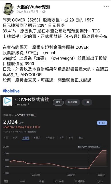 昨天 COVER(5253)股票收盤,從 29 日的 1557 日元連漲到了週五 2094 日元飆漲 39.41%,原因似乎是在本週公布財報預測調升,TCG 卡牌似乎非常的賣,正式季財報(4~9月)將於月中公布