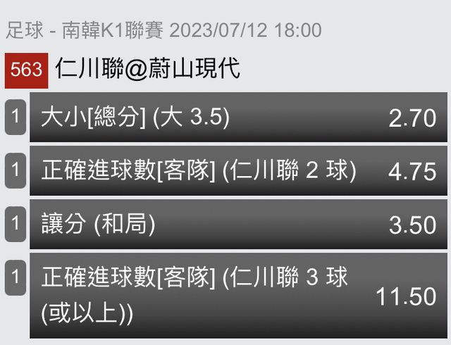 → SalutDeus: 這場是仁川贏 所以是選仁川+1才有錢q 1.200.12.16 07/12 20:30