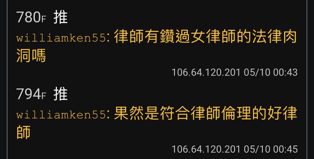 推 williamken55: 律師有鑽過女律師的法律肉洞嗎106.64.120.201 05/10 00:43