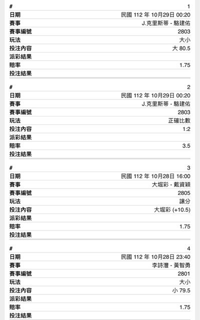 1. 駱建佑vs 克里斯蒂 過去對戰,克佔上風, 不過克最近狀況沒那麼好 看好倒打 主推 全場大分(1.75) 副推 2:1 (3.5) 2. 小戴vs大堀彩 X卡洞 小戴這麼搞 主推受讓+10.5(1.75) 3.李濕瘋vs黃智勇 李狀況不錯 全場主推小分(1.75) 副推2:0(1.85) -- ※ 發信站: 批踢踢實業坊(www.ptt-club.com.tw), 來自: 39.9.68.40 (臺灣) ※ 文章網址: https://www.ptt-club.com.tw/SportLottery/M.1698475038.A.562