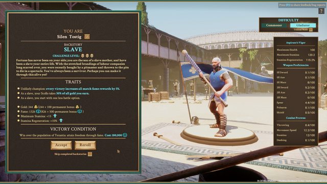 好變得非常困難,而且自身能力非常爛,最終目標則是要得到多數的競技場贊助人的支持