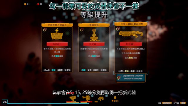 15, 25等分別再取得一把新武器,共計四把。然後每升一級都會獲得三選一隨機的能力
