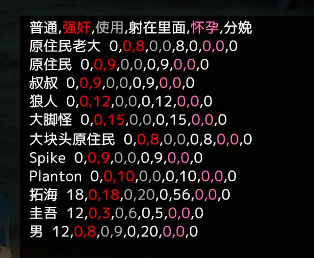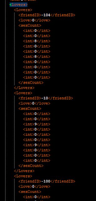 舉例而言這個sexInfo就是做愛次數,第一格位置應該是性行為次數(但現在不採用,他是統計上面那個<Lover>的總做愛次數來計算),第二格則是第一次對象(數值可以去看控制台召喚NPC的數字,前面打一個-),第三格是手淫,剩下是什麼都不知道,改完數值還要自己去核對XD