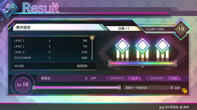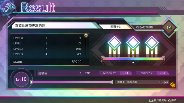 分數經過難度加權後轉為經驗值(體驗版只能玩到困難+3,最高Lv10)